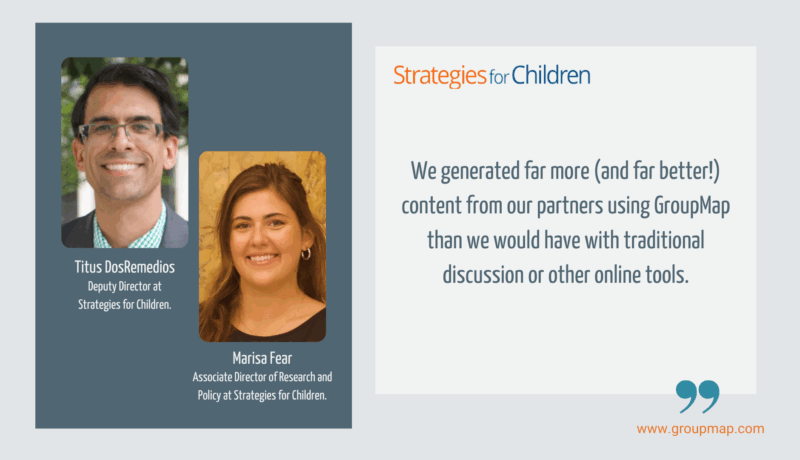 Non-profit, Strategies for Children needed to collaborate with their community to deliver on their ambitious strategic plan. To do so, they included GroupMap in their tool kit to help them build their roadmap toward an integrated and accessible system of support.