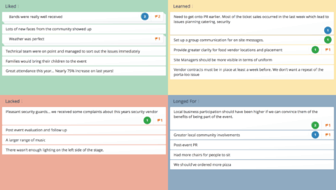 Start by capturing ideas for “Liked” and then move onto the other three quadrants in order. Each idea should be made visible to everyone, and discussed, clarified, and challenged where necessary, to ensure all participants have a shared understanding.