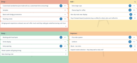 With the template fully populated, the team votes on which ideas that provide the greatest opportunity for improvement and therefore should be actioned. The usual method of voting is to give each team member between one and five votes which they allocate to those issues they feel are the most critical to address. The result is a visual indication of the team’s priorities. |